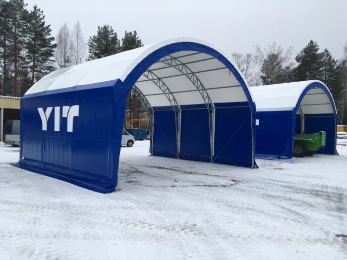 Käyttämämme UV-suojattu 900gr/m2 pressumateriaali on parasta laatua, mitä tässä kokoluokassa on saatavissa. Sen käyttoaikaodotus on n.10-20 vuotta, jopa enemmän. ( Samaa kestävää pressulaatua on käytetty mm. rekka-autojen pressukapelleissa. Kannattaa huomioida, että hallikatteen kestävyyteen vaikuttaa mm. ympäristöolosuhteet ( ilmansaasteet /katteen puhtaus) sekä ennen kaikkea miten kireänä pressun pitää. Vaikka pressuissamme on kattokaarien kohdille laminoitu kaksinkertaiset PVC kankaat, niin silti katteen kireydestä kannattaa huolehtia. On selvää, että paksukin, mutta löysä katemareriaali nihrautuu tuuliolosuhteiessa pikku hiljaa rikki. Katteen löysyys muodostaa katto-osuudelle myös “jää/lumipusseja” jotka venyttävät pressumateriaalia, lisäävät kattokuormaa jne. Katekankaiden paikkaus on myös helppoa eikä koko katekankaan aikanaan uusiminen ole mitään rakettitiedettä jolloin koko halli on jälleen kuin uusi:)) Landtek halleilla on markkinoiden pisin 5v. takuu mikä koskee niin runkoa kuin myös hallikatteita.