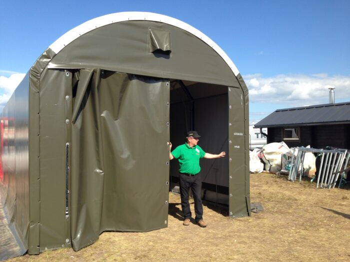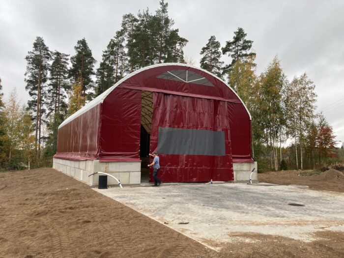 Halli toimitetaan vakiona sivulle liukuvalla laadukkailla laakereoidulla pressuovella. Se on monessa tapauksessa edullinen ja käytännöllinen ratkaisu. Halliin on mahdollista tilata myös sivulle liukuvat teräskehyksellä varustetut levyovet tai jopa upeat, mutta arvokkaat ylös rullautuva alumiiniovet. Kysy tarkemmin myyjiltämme